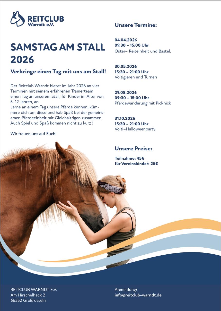 Der Reitclub Warndt bietet im Jahr 2026 an vier Terminen mit seinem erfahrenen Trainerteam einen Tag an unserem Stall für Kinder im Alter von 5-12 Jahren an.